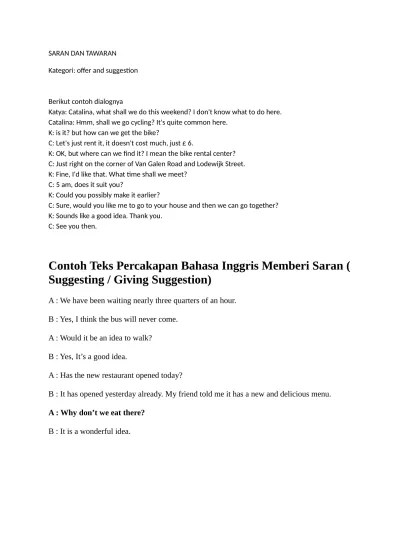 Teks terakhir ini berupa bacaan teks percakapan bahasa inggris meliputi berbagai tema dan kesempatan. Giving and eccepting offers : Contoh dialog percakapan dan kalimat giving suggestion atau memberi saran dalam bahasa inggris. Contoh dialog expression suggest and offer · let's go to the library. You had better know the schedule. · we could eat at . · why don't you do your homework before going out? I know i shouldn't be late. Why don't you make take them to the laundry . Salah satunya adalah cara meminta dan memberi saran dan . I have to wash many clothes now. Contoh percakapan menggunakan expression suggest and offer. · let's go to movies.