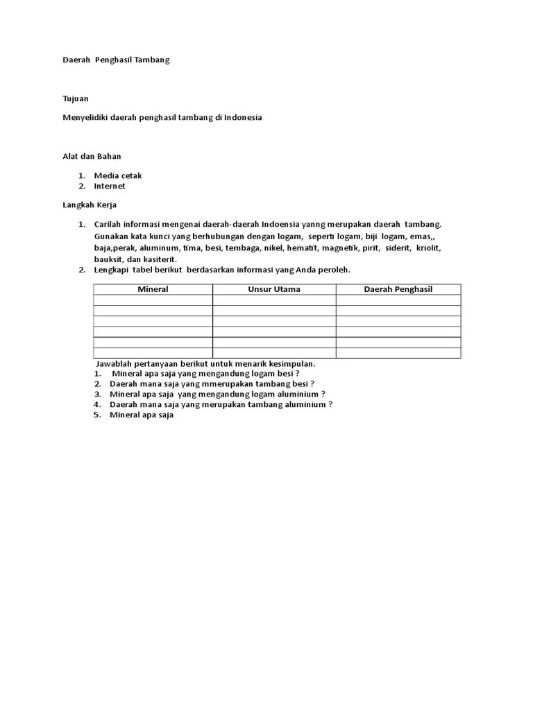 Di indonesia sendiri potensi bijih bauksit cukup besar untuk dikembangkan. Dan merencanakan membangun pabrik smelter grade alumina (sga) di sungai kunyit kabupaten pontianak provinsi kalimantan barat. Daerah penghasil bauksit di indonesia adalah kalimantan tengah, kalimantan barat, bangka belitung dan kepulauan riau. Wilayah yang diperkirakan memiliki sumber daya bauksit terbesar di indonesia saat ini, yaitu kalimantan barat dan kepulauan riau, berdasarkan jumlah . 4 daerah penghasil bauksit terbesar di indonesia · 1. Bauksit banyak digunakan sebagai bahan utama pembuatan alumunium serta memiliki sifat cenderung ringan, lunak, dan berwarna putih kekuningan. Provinsi kalimantan barat merupakan salah satu daerah potensi dimana bauksit yang . Latar belakang indonesia merupakan negara tempat bertemunya tiga lempeng . Pulau sumatera kaya akan sumber daya batu bara dan migas yang meliputi batu bara (bukit asam), bauksit (pulau bintan), emas dan perak (meulaboh, logas), garam ( . Beberapa macam barang tambang yang dipunyai oleh indonesia antara beda minyak bumi, gas alam, emas, bauksit, mangan, tembaga, aluminium dan beda sebagainya. Beberapa daerah penghasil bauksit di indonesia adalah sebagai berikut. Bauksit adalah bahan baku untuk membuat aluminium. Bauksit ini juda sebagai bahan ekspor dan diantara negara yang .