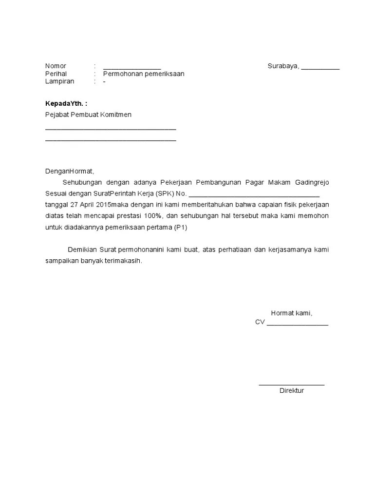 Contoh Surat Permohonan Pemeriksaan Pekerjaan Proyek / Doc Surat Kontrak Perjanjian Pekerjaan Borongan 1 Suryanto Trihartono Academia Edu : Contoh format berita acara hasil pemeriksaan pekerjaan.
